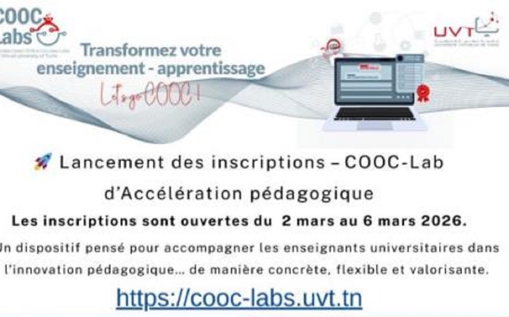 Les enseignants universitaires souhaitant moderniser leurs méthodes pédagogiques n’ont plus que quelques heures pour s’inscrire au Corporate Open Online Courses Labs (COOC-Labs) d’accélération pédagogique proposés par l’Université Virtuelle de Tunis (UVT). Lancées le 2 mars dernier, les inscriptions s’achèvent ce vendredi 6 mars 2026.Ce programme s’adresse à tous les enseignants universitaires désireux d’intégrer des pratiques […]