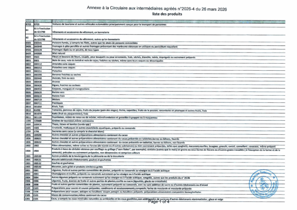 Les marchés publics de l’État, des entreprises publiques et des collectivités locales. Les engagements bancaires déjà conclus avant la date d’entrée en vigueur, si leur exécution a effectivement démarré. Les entreprises industrielles, à condition de produire une fiche technique délivrée par le ministère de l’Industrie attestant le lien direct du produit avec leur activité. Les importations sous régime de perfectionnement actif, sur présentation de l’autorisation douanière.