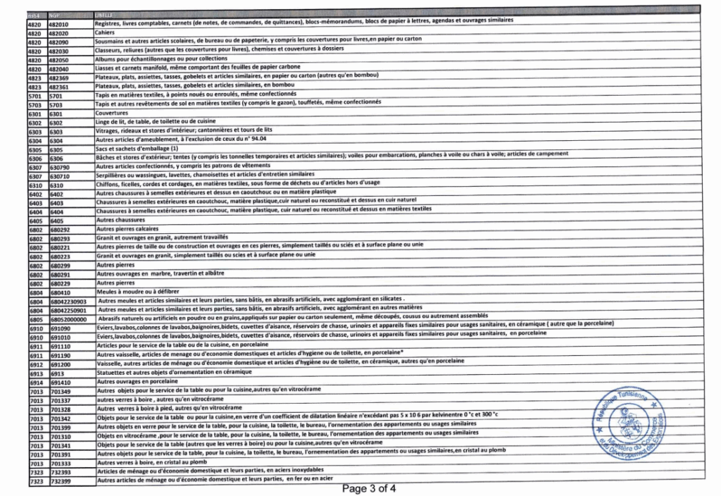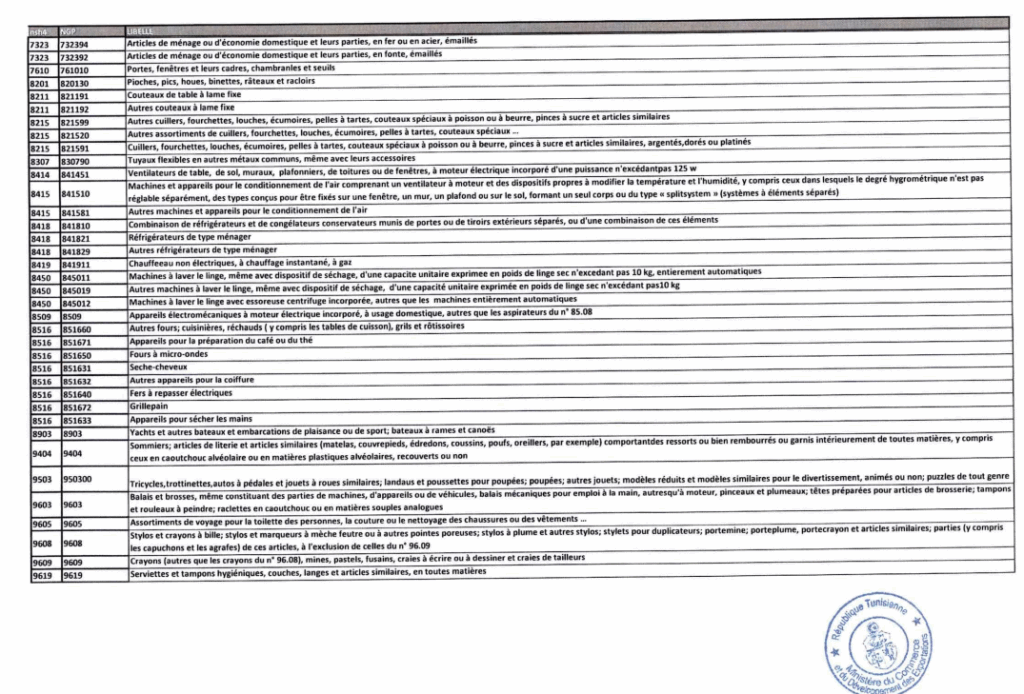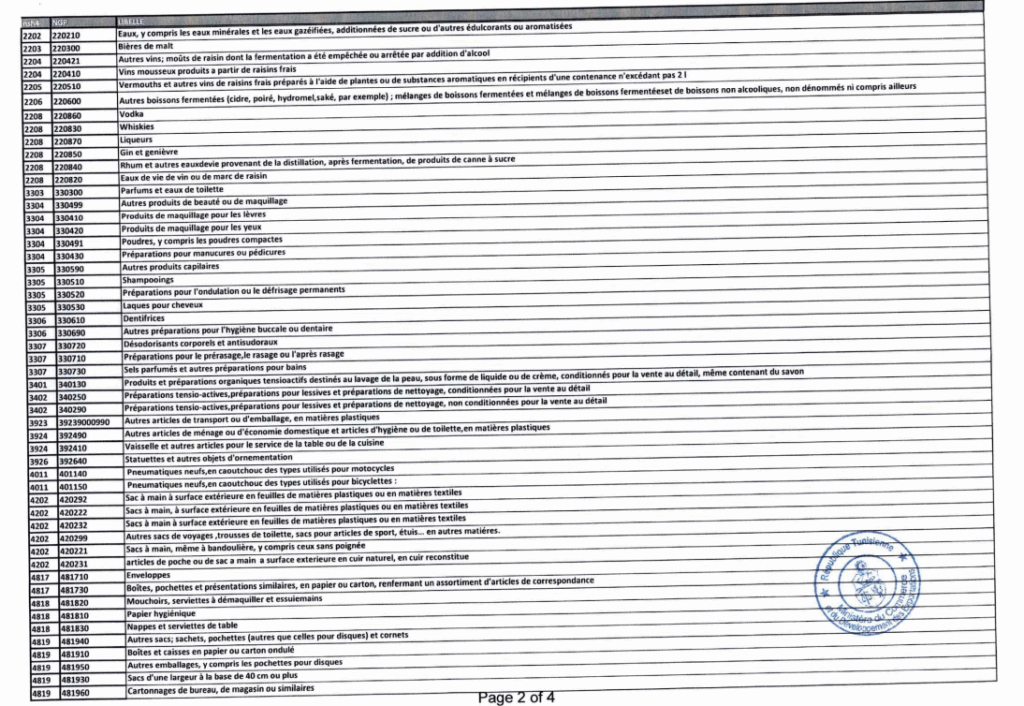 La liste est longue et couvre des biens de consommation courante : voitures de tourisme, vêtements, produits cosmétiques et de beauté, boissons alcoolisées, appareils électroménagers, téléphones, chaussures, articles de papeterie, jouets, meubles textiles, et bien d’autres.