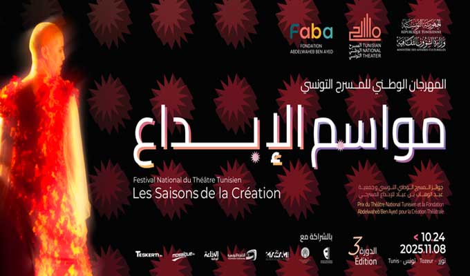 Le festival National du Théâtre Tunisien annonce le lancement d’un appel à candidatures pour participer aux master class qui seront organisés dans le cadre de la troisième de “Saisons de la création ” par le Théâtre National Tunisien, en partenariat avec la Fondation Abdelwaheb Ben Ayed (FABA) et l’Ecole Supérieure de l’Audiovisuel et du Cinéma de Gammarth et qui démarre ce 24 octobre jusqu’au 8 novembre 2025 à Tozeur et Tunis.