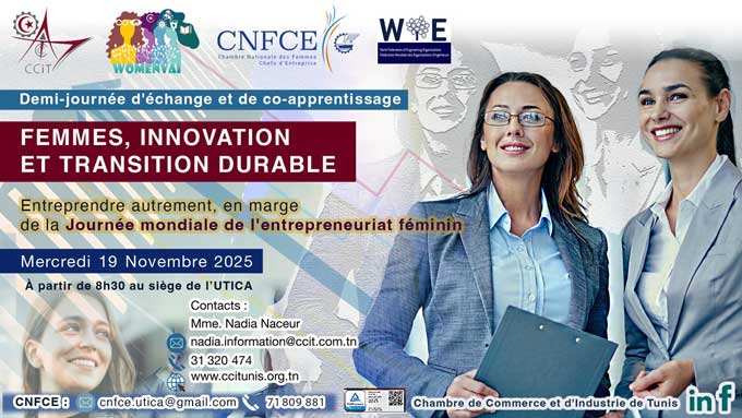 Une journée d’échange et de co-apprentissage dédiée à l’entrepreneuriat féminin durable se tiendra le mercredi 19 novembre 2025 à Tunis, à l’occasion de la Journée mondiale de l’entrepreneuriat féminin.