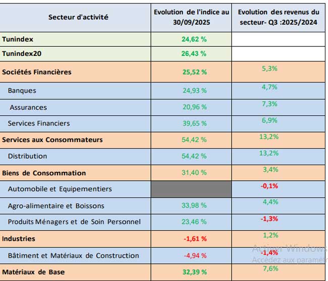 Sur les douze indices sectoriels suivis par la Bourse de Tunis, dix ont clôturé le troisième trimestre sur des performances positives. Les meilleures hausses ont concerné le secteur des Services aux consommateurs et celui de la Distribution, chacun en progression de 54,42 %, ainsi que le secteur des Services financiers, en hausse de 39,65 %.