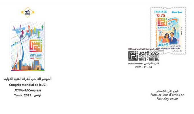 La Poste Tunisienne émet, le 4 novembre courant, un timbre-poste à l’occasion de l’accueil par la Tunisie du Congrès mondial de la Jeune Chambre Internationale (JCI) pour l’année 2025.