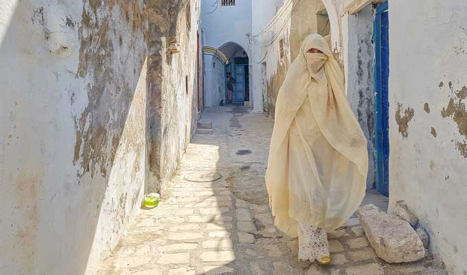 Dans les ruelles anciennes de Kairouan, quand le soleil verse sa lueur sur les murs des demeures authentique de la vieille ville, une silhouette blanche glisse, silencieuse et fière.