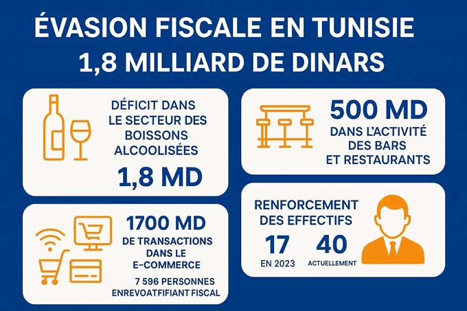 La Brigade des investigations et de lutte contre l’évasion fiscale, connue sous le nom de Police fiscale, a révélé que l’évasion fiscale dans le secteur des boissons alcoolisées en Tunisie s’élève à 1,8 milliard de dinars (MD). Selon Ali Khelifi, chef de la brigade, 500 MD de ce montant concernent spécifiquement l’activité des bars et restaurants. Des contrôles ciblés dans les cafés touristiques et boîtes de nuit du Lac, Gammath et Soukra ont identifié un déficit de 90 MD dans les chiffres d’affaires.