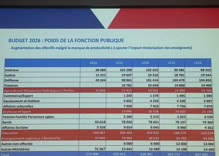 Pour 2026, le déficit dépassera 11 milliards de dinars, représentant plus de 25% du budget total de 79 milliards. Les remboursements de dette atteindront 23,2 milliards, la masse salariale 25 milliards. Ces deux postes absorbent l’essentiel des ressources disponibles. Louzir résume: “Les dépenses sont engagées dès le départ, les recettes restent à aller chercher”. La pression fiscale tunisienne rivalise désormais avec celle des pays de l’OCDE et dépasse de seize points celle des pays africains. Les recettes fiscales représentent 75% des dépenses totales, finançant essentiellement le fonctionnement courant de l’État.