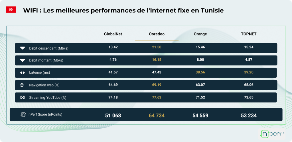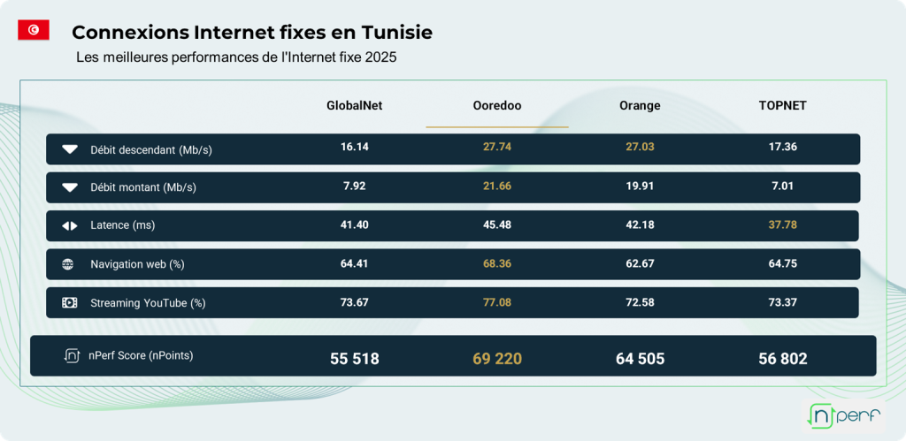 Selon les données des connexions Internet fixe en Tunisie durant la période d’analyse (1er janvier – 31 décembre 2025), Ooredoo s’impose comme leader de l’Internet fixe en Tunisie pour l’année ernière. Cette édition du baromètre annuel nPerf révèle une forte compétition sur les débits descendants et des progressions comprises entre 8,6% et 24,2%.