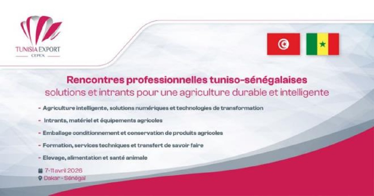 Des rencontres professionnelles tuniso-sénégalaises dédiées principalement aux solutions et intrants pour le secteur de l’agriculture  se tiendront , du 07 au 11 avril 2026 à Dakar(Sénégal).    Organisé à l’initiative du Centre de Promotion des Exportations (CEPEX) et en collaboration avec l’Ambassade de Tunisie à Dakar,  cet évènement a pour objectif d’explorer les nouvelles opportunités […]