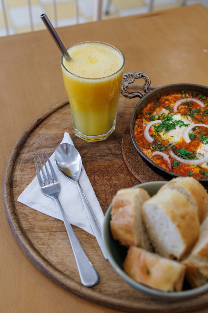 Je me suis réfugiée chez Bleue Deli, un café de la rue Habib Thameur. La lumière du soleil inondait les carreaux jaunes et blancs à travers les fenêtres ouvertes. L’expresso sifflait de la machine, et l’odeur beurrée du mlawi, une galette tunisienne moelleuse (5 dinars), flottait depuis la rue. Des adolescents tunisiens branchés sirotaient des smoothies et bavardaient en arabe et en français.