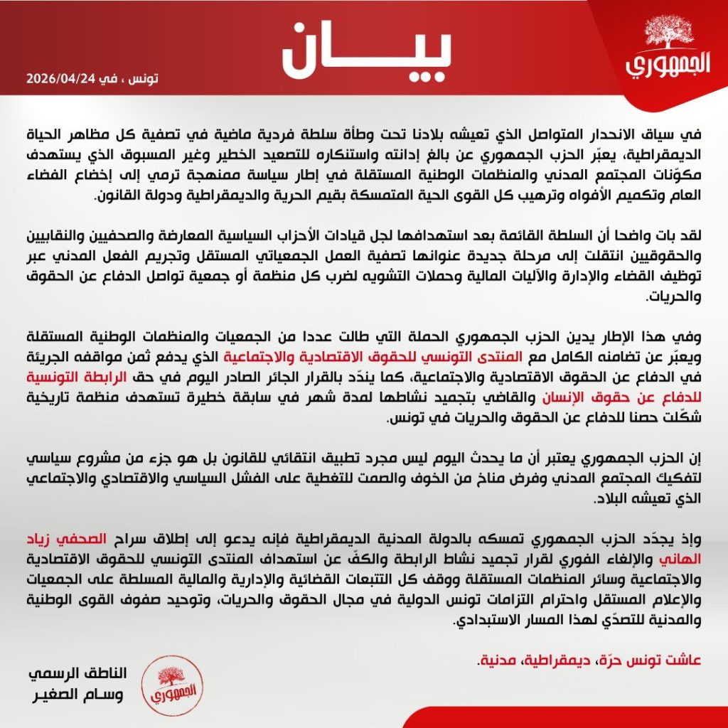 Le Parti républicain a réaffirmé son engagement envers un État civil démocratique, appelant à la libération du journaliste Zied El-Hani, mis en garde à vue il y a deux jours, à l’annulation immédiate de la décision de geler les activités de la Ligue, à la fin du «ciblage» du FTDES et d’autres organisations indépendantes, à l’arrêt de toutes les poursuites judiciaires, administratives et financières contre les associations et les médias indépendants, et au respect des obligations internationales de la Tunisie en matière de droits et libertés.
